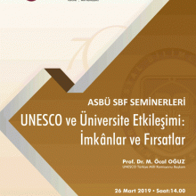 UNESCO Turkey National Comission Chair Prof. Dr. M. Öcal Oğuz will give a lecture titled "UNESCO ve Üniversite Etkileşimi: İmkânlar ve Fırsatlar" as part of the ASBU SBF Seminars on Tuesday, 26.03.2019 at 14:00. The event will be held in Güvercinlik Meeting Hall, and everyone interested is invited.
